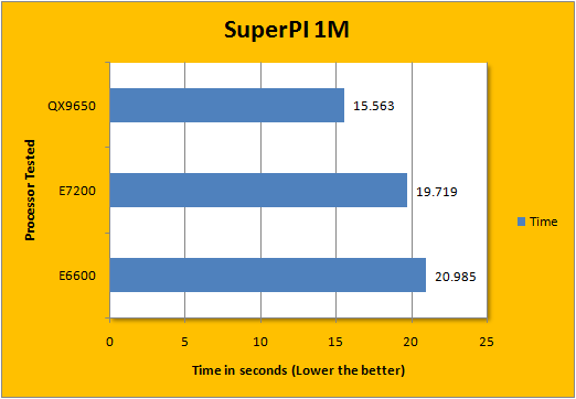 SuperPI is a single threaded benchmark, so we can once again see the independent core performance of each processor compared. The QX9650 finished calculating to one million digits of Pi in 15.563 seconds, a total of 4.156 seconds faster than the Penryn E7200 CPU.