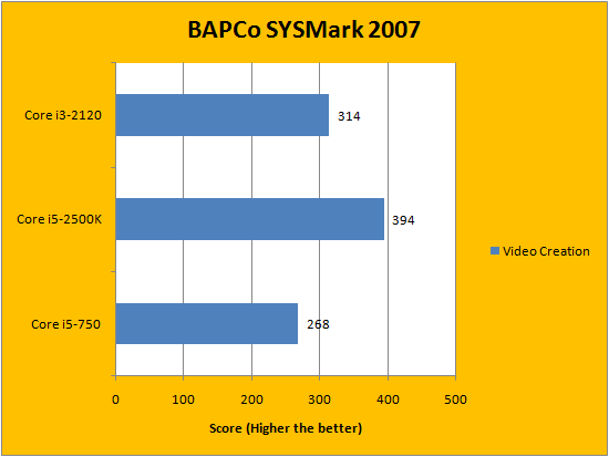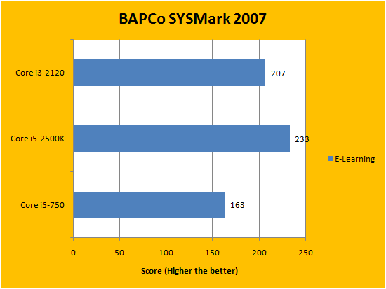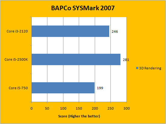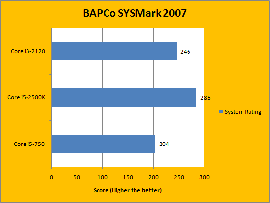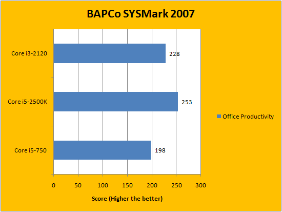 BAPCo's SYSMark 2007 is one of our favorite computer performance evaluation benchmarking suites, because it uses real life applications to obtain real life results. From Photoshop to Microsoft Office, it has all of them covered. It is actually quite interesting to watch, too -- as you witness programs open and close by themselves, the tests automatically in the foreground. Although the Intel Core i5-750 would probably outperform the Core i3-2120 with Turbo Boost enabled, with all of them running at its specified frequencies, the i3-2120 -- minus two cores, no less -- performed exceptionally well; and slotted right between both tested processors.