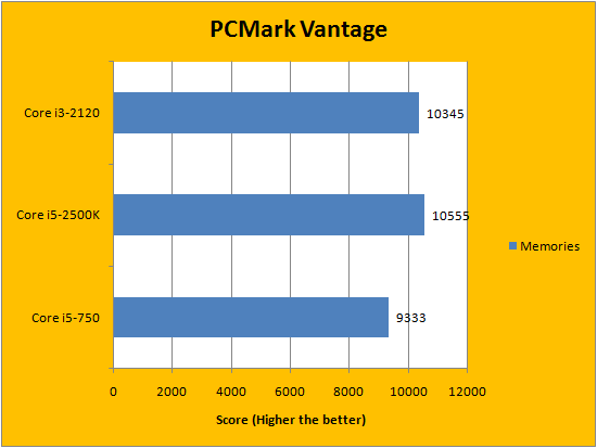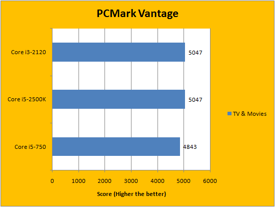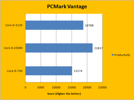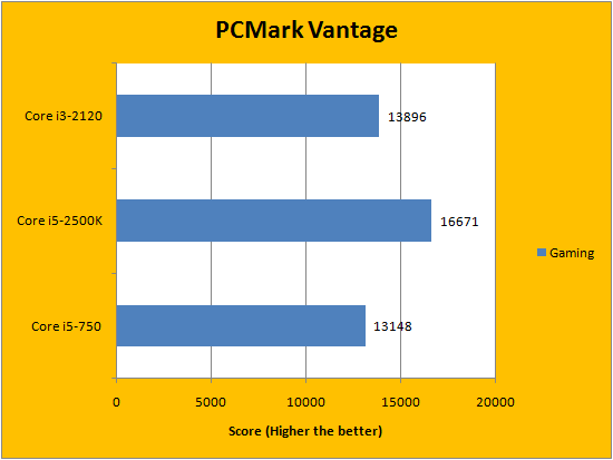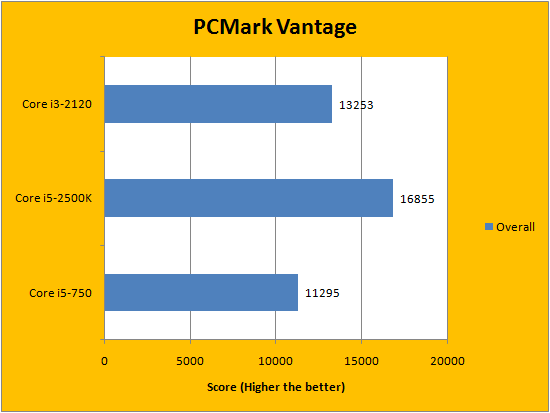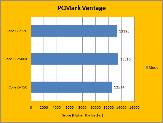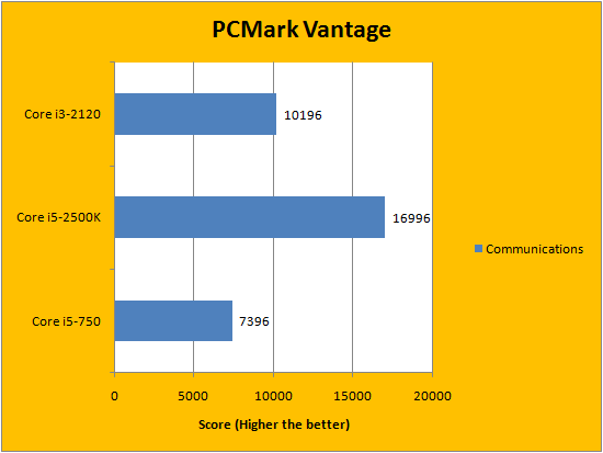 PCMark Vantage is a favorite benchmarking program for PC enthusiasts and reviewers alike, because it provides a very easy way to measure performance of different computers. It evaluates a system from eight perspectives (We only included the first seven results, since the HDD test is not very relevant to a CPU review), and can be considered a synthetic real life benchmark. Like our BAPCo SYSMark 2007 results, the same trend can be observed in our charts above. The Intel Core i3-2120 slotted nicely between the Core i5-2500K and Core i5-750. It is important to note both i5 CPUs have Turbo Boost, but were disabled in our tests; whereas the Sandy Bridge i3 does not have Turbo Boost in the first place.
