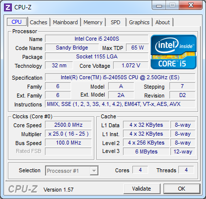 CPU-Z screenshot of the Intel Core i5-2405S processor, running at stock speeds with Intel Turbo Boost disabled. This is an engineering sample unit.