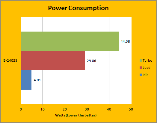Since we switched our test platform to an ASUS motherboard rather than our previous Gigabyte motherboard, I am not entirely sure if the results are comparable with regards to the power consumption numbers. The idle power usage may vary by one or two watts, and that is very significant in our graph above. Therefore, I chose not to compare the previous results, and obtained some new ones for the Intel Core i5-2405S instead. According to ASUS' EPU software, it reports power usage of 4.91W under idle conditions at only 0.952V. Under load, this figure jumps to 29.06W at 1.072V. Even if these results are comparable against the i3-2120 and i5-2500K on the Gigabyte GA-P67A-UD5, that is quite a bit less than even the i3-2120's posted numbers of 33.28W -- very impressive. With Turbo Boost turned on, the power consumption is still only to 44.38W at 1.160V. Fundamentally, these are objectively very low voltages across the board -- and despite the differences in design between the ASUS P8P67 PRO and Gigabyte P67A-UD5 (It seems that Gigabyte motherboards like to post lower numbers on average in this regard), thanks to its noticeably lower operating temperatures compared to the 95W TDP processors, there is enough hard evidence to convince us the 2405S does, in fact, deliver as promised. And while the software may lie about power consumption numbers, voltage figures are almost always very accurate.