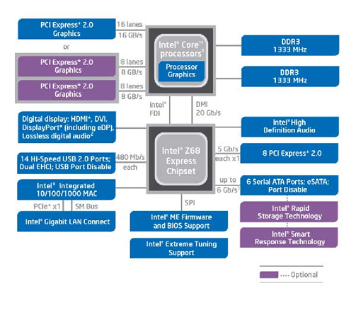 Three chipsets designed for Sandy Bridge processors are available to consumers at press time. Codenamed Cougar Point, the H67 is aimed at mainstream consumers who are not interested in overclocking, but want to take advantage of the integrated graphics. Enthusiasts who want to overclock or use multi-GPU configurations will need to buy motherboards based off the P67 chipset. The Intel Z68 consolidates the best of both worlds, and adds SSD caching to the features list. Common to H67, P67, and Z68 is UEFI support -- pretty much the first time this has hit mainstream with desktop PCs. The biggest advantage to UEFI motherboards are 3TB+ HDD support, more flexible network booting, and much nicer GUIs for the setup screen. As with first generation Core family CPUs, what was previously known as the Southbridge now takes care of the standard connection interfaces such as providing up to 14 USB ports and 6 SATA ports (Of which two of them are SATA 6Gb/s), as well as providing eight additional PCI Express lanes for PCIe based devices such as Ethernet. There is no native USB 3.0 support, so it will still go through a third party controller. Because many Northbridge functions are now on the CPU itself as aforementioned, P67 and Z68 chipsets didn't do nearly as much as it did in the past -- thus, Intel has resolved to call it the Platform Controller Hub, or PCH, just like the P55.
