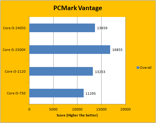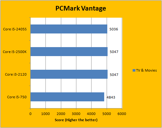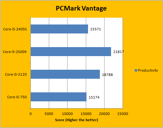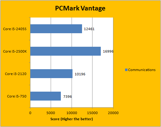 PCMark Vantage is a favorite benchmarking program for PC enthusiasts and reviewers alike, because it provides a very easy way to measure performance of different computers. It evaluates a system from eight perspectives (We only included the first seven results, since the HDD test is not very relevant to a CPU review), and can be considered a synthetic real life benchmark. As you can see in our graphs above, some tests favored higher clock speeds, while others preferred having more cores. Again, do keep in mind our Intel Core i5-2405S' Turbo Boost feature is disabled. With appropriate cooling, the 2405S can easily run at 3.0-3.3GHz at all times, making it outperform the i3-2120 easily like the 2500K results above. The Core i3-2120 has no Turbo Boost feature available.