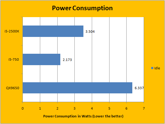 Power consumption has also been improved. We took our measurements with Intel SpeedStep enabled for both processors running at stock voltages and configuration. I turned Gigabyte's Dynamic Energy Saver off, but enabling it will reduce the i5-2500K's idle power to 0.853W. Note that Turbo Mode is enabled for both the Core i5-750 and Core i5-2500K. As seen in our results above, Intel's Core i5-750 uses less power than the Core i5-2500K while idling. However, under load, the Core i5-2500K consumed only 45.09W -- while our Core i5-750 and Core 2 Extreme tipped the meter at 55.63W and 60.51W under full throttle, respectively.