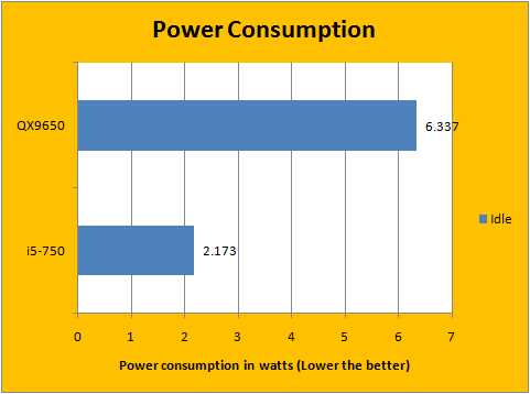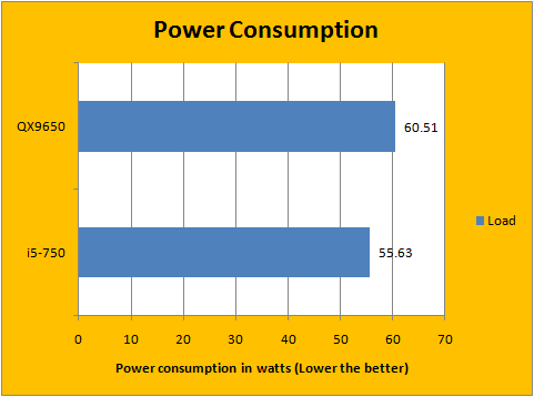 We took our measurements with Intel SpeedStep enabled for both processors running at stock voltages and configuration. Note that Turbo Mode is enabled for the Core i5-750. As seen in our results above, Intel's Core i5-750 power consumption has been improved over its predecessor -- during idle, the Core i5-750 only uses 2.173W of power -- compared to the Core 2 Extreme at 6.337W. Meanwhile, under load, the Core 2 Extreme tipped the meter at 60.51W, while the Core i5-750 came in slightly lower at 55.63W at full throttle.