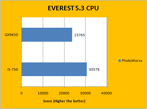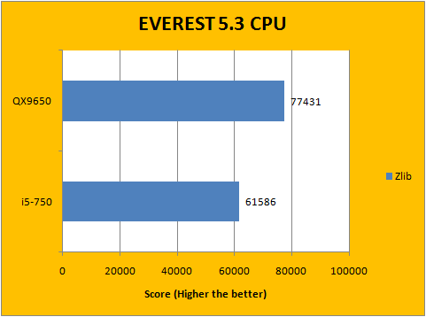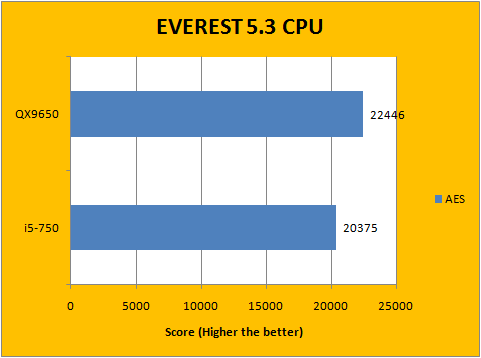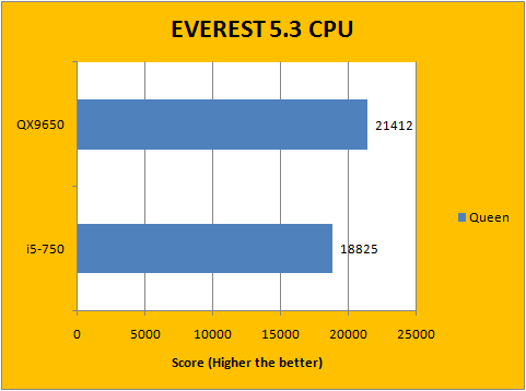 Our first battery of benchmarks rolled around, and provided fairly interesting results. Neither the Core 2 Extreme QX9650 nor the Core i5-750 was able to grab a clear win in this regard. As you can see in our EVEREST 5.3 CPU tests above, the QX9650 demonstrated a 13.7% performance advantage over the i5-750 in Queen, 10.2% in AES, as well as a 26% difference in Zlib, while the Core i5-750 had an impressive 28.7% lead in PhotoWorxx against the last-season flagship.