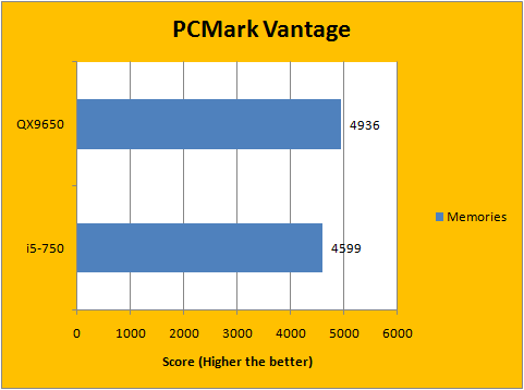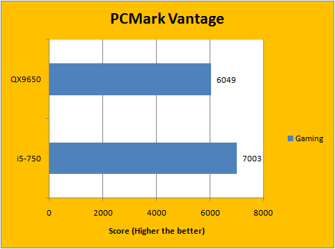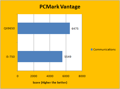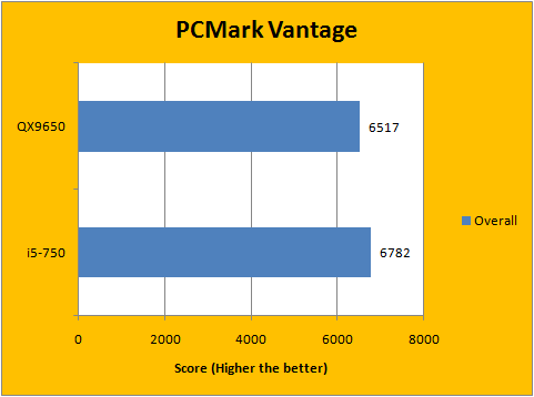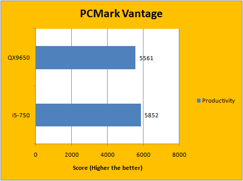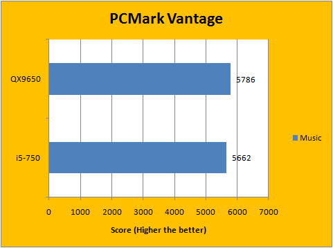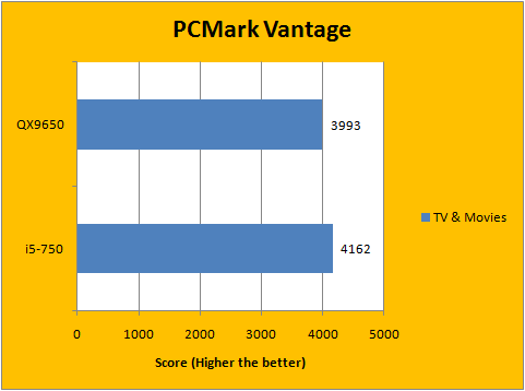 Our Futuremark PCMark Vantage results further demonstrated the excellent capabilities of the Core i5-750 against its predecessor, the once performance-monster Core 2 Extreme. The Core i5-750 actually led in four out of seven results -- very impressive. Starting from TV & Movies, the Core i5-750 had a 4.23% advantage, followed by Gaming and Productivity at 15.8% and 5.23%, respectively. For the ones the Core 2 Extreme QX9650 led in, it scored 7.3%, 2.2%, and 16.7% for Memories, Music, and Communications, respectively. Overall, the Core i5-750 scored 4.1% better than the QX9650, according to PCMark Vantage.