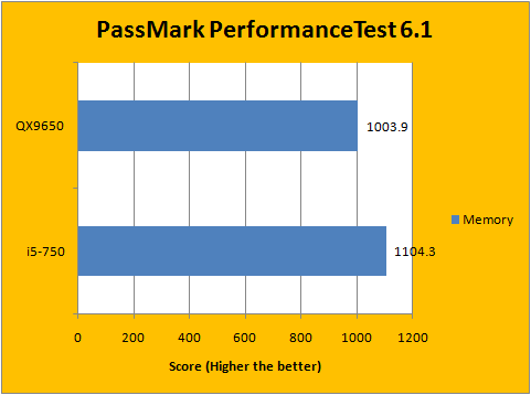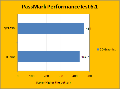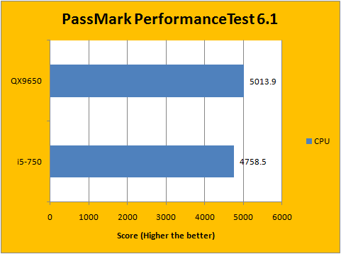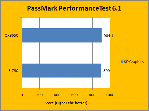 PassMark's PerformanceTest 6.1's results generally favor the Core 2 Extreme QX9650, but they are pretty close nonetheless. A quick glance at our results above show that the QX9650 scored 5.4%, 7.5%, and a statistical tie for CPU, 2D Graphics, and 3D Graphics, respectively. Unsurprisingly, the Core i5-750's integrated memory controller really came into play as it showed a 10% higher score than the QX9650 in the Memory benchmark.