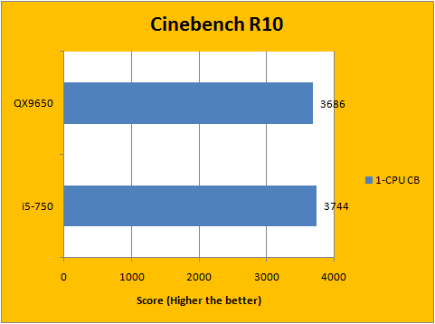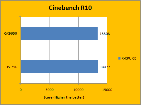 Again, despite being very close, I was pleasantly surprised that the Intel Core i5-750 actually delivered almost identical performance than the Core 2 Extreme QX9650. It scored approximately 3% higher than the Core 2 Extreme in single threaded mode, and a statistical tie with all four cores running. The former gap can probably be closed if Cinebench R10 was to be run a few more times, too.