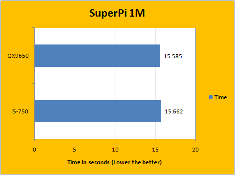 The Core 2 Extreme QX9650 held a slight advantage in calculating to one million digits of Pi compared to the Core i5-750. The result? The QX9650 was 0.077 seconds faster. Talk about being close!