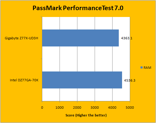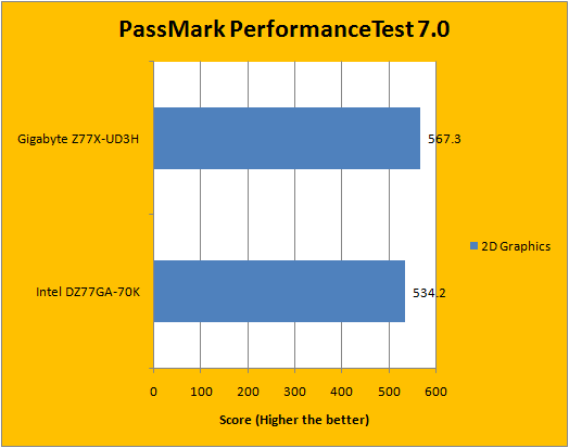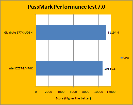 We run PassMark PerformanceTest 7.0 to evaluate four different areas of our system; coming down to the CPU, RAM, 2D Graphics, and 3D Graphics. It takes a somewhat different approach in obtaining results compared to other programs, which is why we like to use it, haha. From what we see above, all the scores are quite similar, with the Intel Desktop Board DZ77GA-70K slightly behind in most tests. Again, do keep in mind the Gigabyte GA-Z77X-UDH3 has a CPU that is running a bit faster than when it is on the Intel motherboard, so any differences you see here may be just due to an out of the box overclocking advantage.