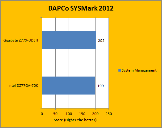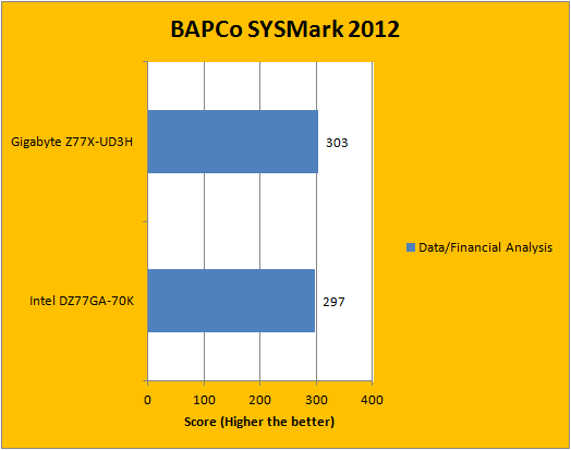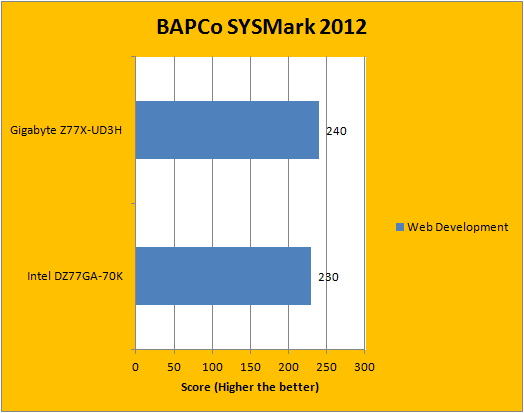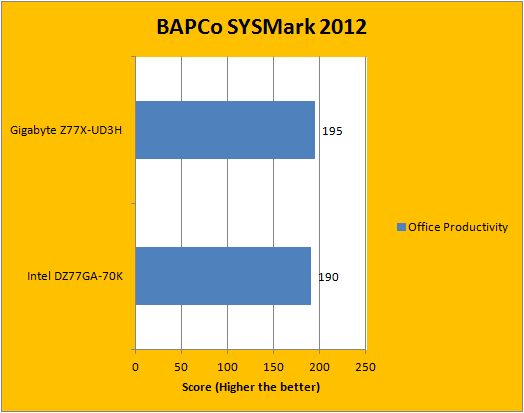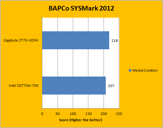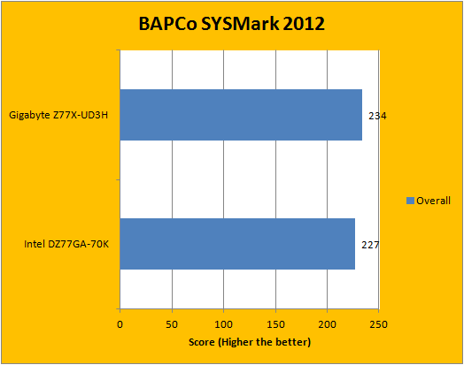 BAPCo's SYSMark 2012 is one of our favorite computer performance evaluation benchmarking suites, because it uses real life applications to obtain real life results. From Photoshop to Microsoft Office, it has all of them covered. It is actually quite interesting to watch, too -- as you witness programs open and close by themselves, the tests automatically in the foreground. The 2012 version utilizes updated programs since 2007, and now offers a more refined set of results. We did triple iteration on both motherboards (These 8 hour tests are long!), and with many watts of electricity consumed, the results are as above. Since we have done so many runs with consistent results, we can safely say that the Intel motherboard was consistently outperformed its Gigabyte counterpart by a small margin across the board, again, probably due to some minute out of the box CPU overclocking as a performance "cheat".