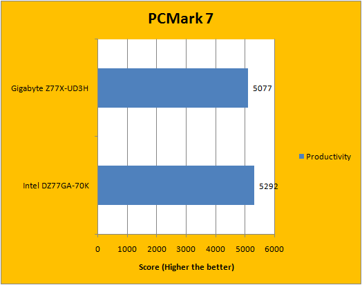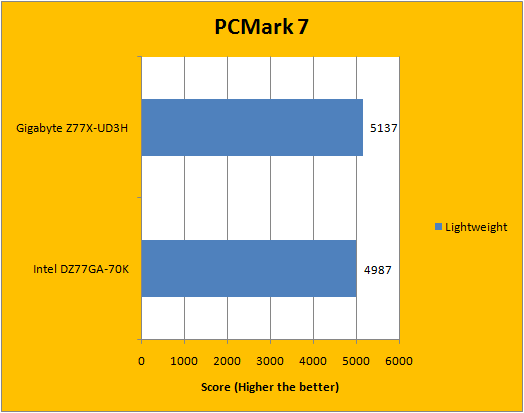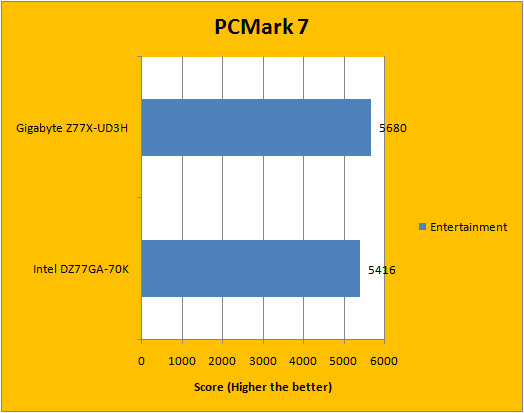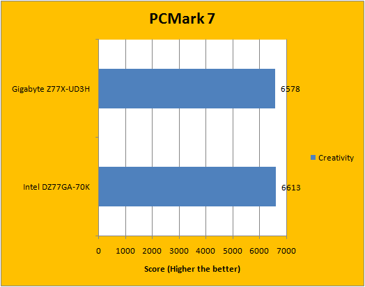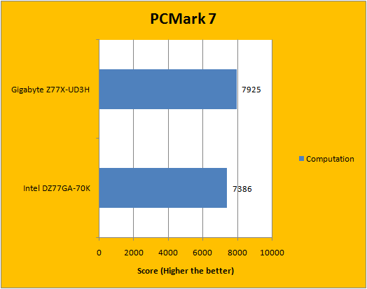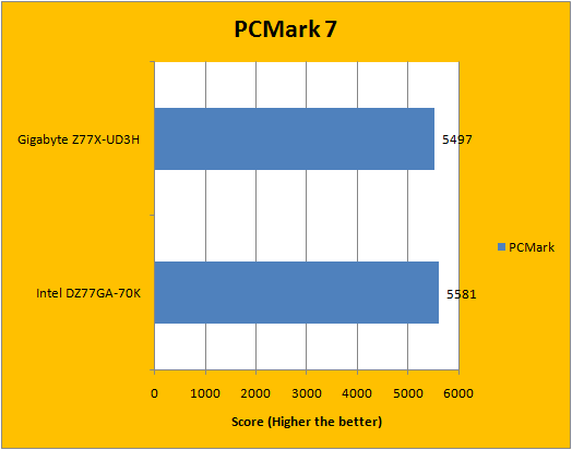 PCMark 7 is a favorite benchmarking program for PC enthusiasts and reviewers alike, because it provides a very easy way to measure performance of different computers. It evaluates a system from seven perspectives, and can be considered a synthetic real life benchmark. It is quite comprehensive, as it not only measures CPU and RAM performance, but also your hard disk drive for a complete computing experience. As you can see in our graphs above, the Intel Desktop Board DZ77GA-70K and Gigabyte GA-Z77X-UD3H consistently traded spots, but still remained extremely close to each other, even though Gigabyte gives the CPU a slight overclock out of the box.