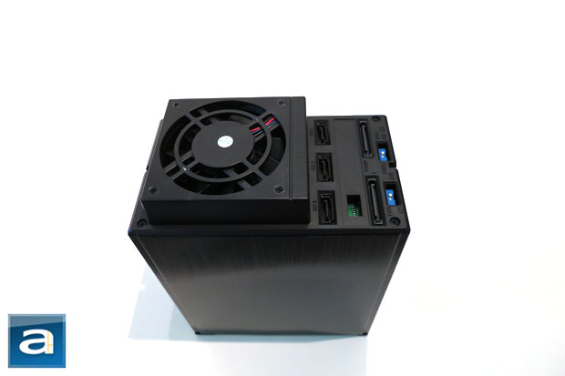 Going to the back of the iStarUSA BPN-DE230SS-SILVER, we can see the part that will be housed inside the computer chassis. On the left, there is a moderately sized 70mm fan. Given the size of this product, the inclusion of a 70mm fan seems just right, as it is just big enough to fit on to the back without having it protruding too much. This fan protrudes by at most 20mm from the rest of the product, and should do an adequate job of cooling our three hard drives. Other than the holes in front and the opening for the fan, there is no other room for air to dissipate except through the aluminum. Hopefully your computer case used will have enough cooling to draw the air back out of this area quickly, since a lot of heat will be generated if three hard drives are all in use at once.