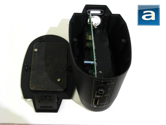 There are two main components of the iStarUSA xAGE: the plastic casing, and the base plate. The green PCB/controller board is attached to the plastic enclosure and is placed vertically to the normal. The 2 LEDS in the front are actually soldered directly to the PCB. The base plate is composed main of a big black iron weight that is used to add weight to the overall dock. It is held on by two screws to the base cover; which can be easily removed -- if you ever need to. The purpose of the weight is to make sure there is a lower center of gravity, thus making the dock itself much more stable against counteracting forces.