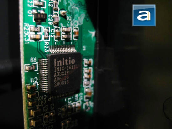 On the green PCB, the main piece is the Initio INIC-1611L SATA USB 2.0 bridge. Specifications as follows: