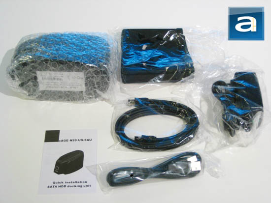 The internal packaging for the product is very simplistic; there are no cardboard dividers of any kind inside. The individually wrapped clear plastic bag packages are just stacked on top of one another. The dock itself is wrapped in a plastic bubble wrap bag, which reduces and prevents damage to the unit caused by potential bumps or any external forces/shocks. Out of the box, you will find the iStarUSA xAGE-N99-SAU dock itself, USB cable, eSATA cable, AC adapter, instructional booklet, and surprisingly, 2.5 inch and 3.5 inch silicone hard drive protectors.