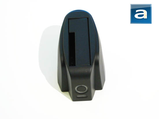 The front of the dock has two separate blue LEDs; one of it is in done in a circular fashion as a ring with translucent plastic finish. It's used to indicate whether the HDD docking station is powered on or not. Below that is another LED, but this time it is rectangular. This LED is used to indicate hard drive activity. Meanwhile, the top of the iStarUSA xAGE includes the spring loaded push-down cover for the insertion of either a 2.5 inch or a 3.5 inch hard drive. The cover pops down when a 3.5 inch hard drive is inserted and pops up when it is removed. There is also a small cutout in the plastic, where the 2.5 inch hard drive fits in in the same fashion.