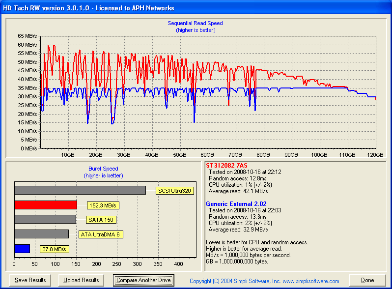 The rest remains virtually identical the same as far as latency/random access goes. However, in terms of burst, the test conducted using eSATA connection had 152.3MB/s score. USB's result is just roughly 2MB/s over its consistent read speed.