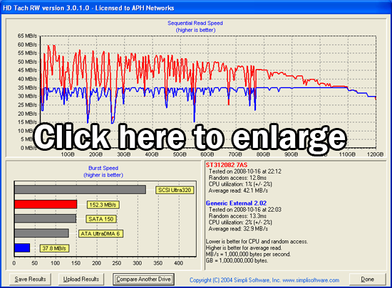 As you can see in our benchmark results above from HDTach RW 3.0.1.0, USB2.0 (Blue line) resulted in a constant sequential read speed, while eSATA (Red line) had faster read speed at the beginning of the drive and much drops as it approaches the other edges. This is very common for hard drives, and a comparison graph as shown above is a clear demonstration of USB bottlenecking the drive as the read speed is consistently slower than the slowest read speed obtained using eSATA at the end of the drive. The consistent spikes seems somewhat odd as observed in the graph above, but the test has been ran multiple times with the same result.