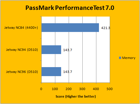 Up until this point, it probably isn't surprising that the AMD Athlon 64 X2 based Jetway NC84E-LF kicked the Intel Atom D510 based NC94FL-510-LF and NC96FL-510-LF like what Portugal did to North Korea on June 21st at Cape Town. But wait a second -- what's the dealio with the 3D graphics score? We have made no mistake; it is actually PassMark PerformanceTest 7.0's algorithm of determining the overall score. Apparently, because the NC94 and NC96 didn't even complete the entire battery of benchmark, it gave them a high overall score -- the ATI Radeon HD 4200 didn't pull much FPS for the HDR rendering test (Not surprisingly). so it pulled down its overall 3D average.