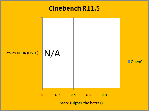 No one buys an Atom based computer to do graphics rendering (At least I don't hope so!), but still interesting results to post nonetheless. Just for your reference, a quad core Intel Core i7 typically gets a little over 5.00, depending on model and socket. The OpenGL benchmark won't run, again due to hardware limitations of the integrated graphics accelerator.