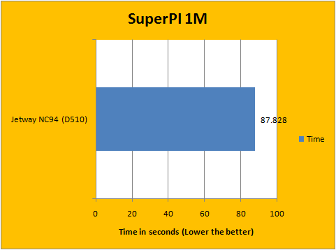 Here's one test that the Intel Atom D510 isn't quite good at, haha. This is not a multithreaded application, and calculation times favor CPUs with high FPU performance in general. Most modern processors should be able to complete this test in less than 25 seconds, but the Atom took nearly one and a half minutes. I vaguely recall my Newcastle core Athlon 64 3000+ back in the days did the same benchmark in around 47 seconds, while the midrange Core i5-750 finished to one million digits of Pi in under 16 seconds.