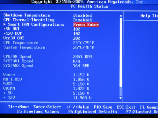 The usual stuff such as temperature and voltage readings is found in PC Health Status. Jetway's Smart Fan Configuration menu allows the user to independently adjust fan speed based on system temperature, which includes the threshold CPU temperature for the fan to engage at full speed, idle temperature and idle fan speed percentage. It works very well, and I found this feature to be extremely useful to slow down the fans when they are not needed.