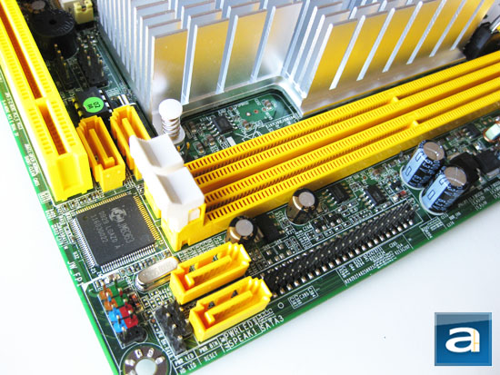 On the left side of the aluminum heatsink is a Mini-PCIe slot, for use with components such as internal wireless cards. The main expansion slot is a PCI slot, which is quite surprising since it is already 2010 that we are writing this review, having a PCI slot as the primary expansion socket has very limited use. A built in speaker is located between the yellow PCI slot and the Mini-PCIe slot as aforementioned. A Realtek RTL8111DL chip can be seen here to provide support for the Jetway NC96FL-510-LF's Gigabit Ethernet port over its internal PCI Express interface. Located within close proximity is Realtek's RTM875T-605 clock generator chip, and the board's third 3-pin fan header. The Jetway NC96FL-510-LF also has three internal USB headers located between the PCI slot and NM10 chipset, as well as a front panel audio header just to the left of the PCI slot.