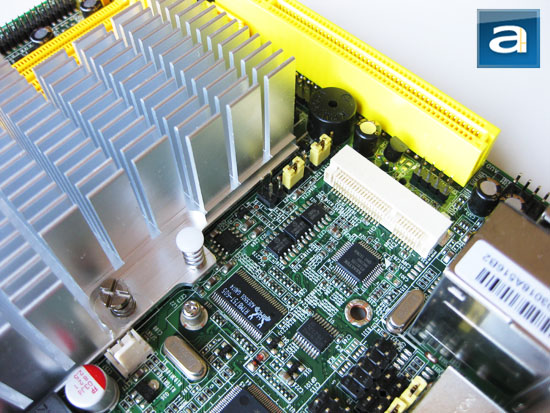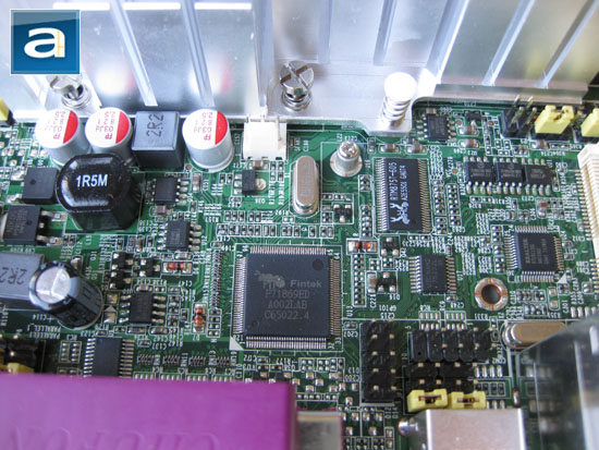 Shifting our focus a little down, a Fintek F71869ED chip comes into view. This application specific integrated circuit provides system data on fan RPMs, voltages, and temperatures. Miscellaneous headers include an internal GPIO and COM2 connector; both can be seen in our photo above. Overall, the Jetway NC96FL-510-LF is a fairly simple motherboard by today's standards; and the layout is generally straightforward. I would certainly appreciate it if the internal USB headers as well as the two SATA ports native to the NM10 chipset were placed closer to the edge (Or at least swapped places with the JMicron powered SATA ports for the latter), but other than that, neat cabling can easily be executed with this mini-ITX motherboard.