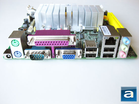 The Jetway NC96FL-510-LF features a pretty standard Intel NM10 chipset based motherboard connector configuration at the back panel. From the top, we have a DC 12V power input, PS/2 ports for both keyboard and mouse, parallel port, serial port, VGA port (No DVI available due to chipset limitations), four USB ports, Gigabit LAN, and three 3.5mm jacks. Video is provided by the Intel Graphics Media Accelerator 3150 on the D510 processor. The Intel NM10 chipset has native support for up to eight USB 2.0 ports, and the Jetway NC96FL-510-LF has seven -- four external as shown, plus three internal headers -- but personally I would prefer more USB ports in place of mostly unused legacy ports such as the PS/2 connectors (It is important to note that some commercial applications may still have use for the legacy serial and parallel ports). The 3.5mm jacks at the back are powered by Realtek's ALC662 audio codec for up to 6-channel output; where two of these jacks can be configured as multichannel output in addition to default line-in and microphone inputs. It probably won't be a big issue even when configured for multichannel output, since most chassis has front panel input jacks anyway.