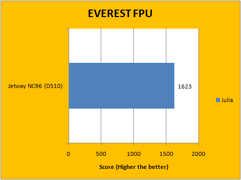 FPU performance isn't necessarily the D510's strong points, but still provides commendable performance for a budget low power consumption CPU (Just don't try to compare it against a Core i5 or i7, haha). The Julia benchmark score is comparable to the Core Duo T2500 once again, and the rest of the test results -- Mandel and SinJulia -- is roughly on the same level as a Pentium M 730 and 2x Pentium III-S 1.26GHz, respectively.