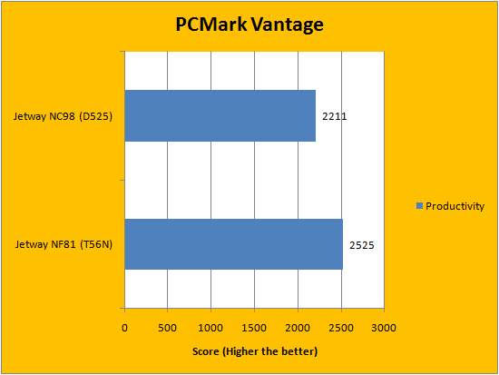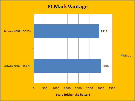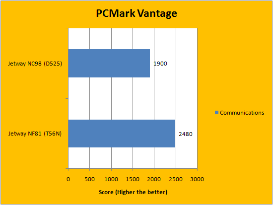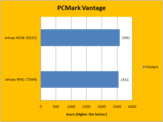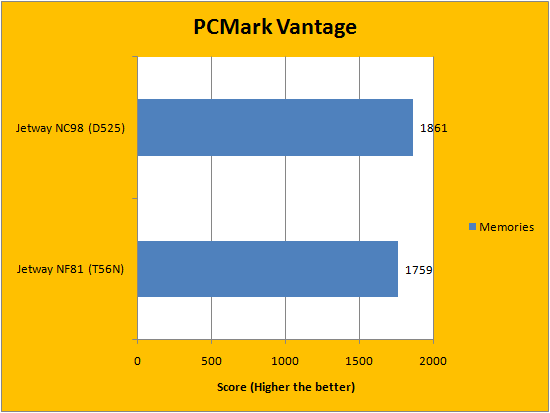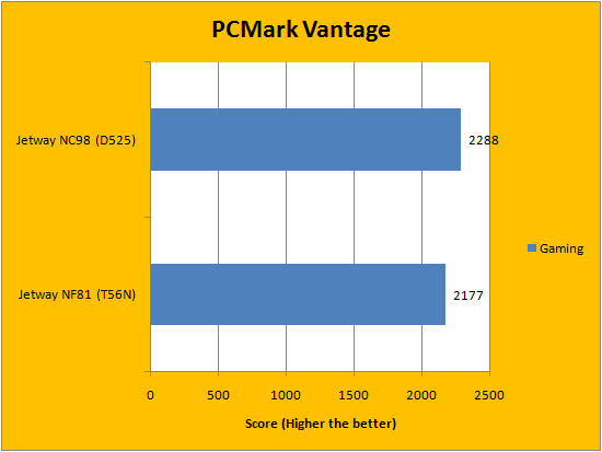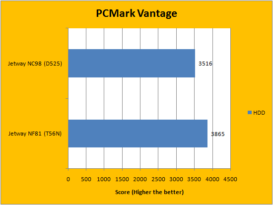In terms of the PCMark Vantage results, the Atom D525 with NVIDIA ION 2 had a slight edge on the eOntario T56N with AMD Radeon HD 6310 in the overall PCMark score. Although the eOntario based system beat the Atom based system in every area except memories and gaming, the overall higher score was given to the Atom "for some reason". This is probably due to PCMark Vantage's weighting algorithm, but every result is posted in our graphs above for you to view. It is important to reiterate that the AMD Radeon HD 6310 shares memory with the RAM, since it does not have dedicated memory. However, in terms of the rest of the scores, the Jetway NF81 scored significantly higher.