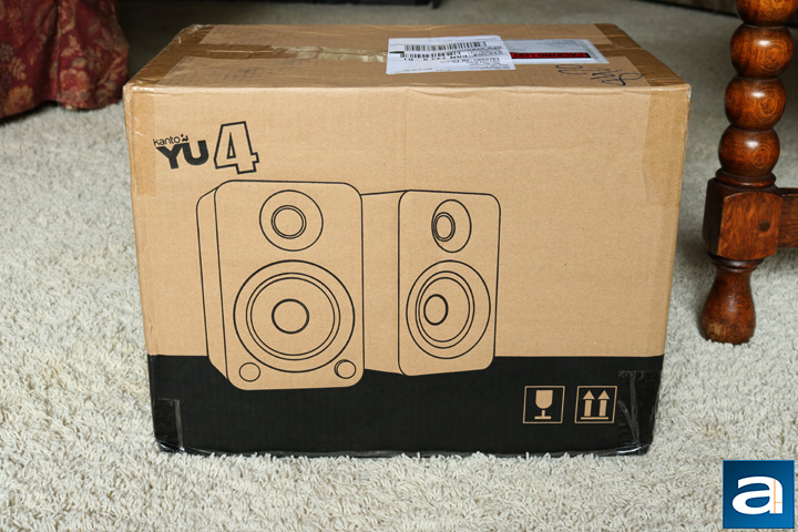 The Kanto YU4 arrived in a rather large brown corrugated shipping box. It actually did not have to travel far, as it shipped from Coquitlam, British Columbia, Canada via UPS Standard to Calgary, Alberta. With such a short travel distance, it is expected that there was not much damage done to the shipping package, which is true. The box arrived in great condition. As usual, the edges and corners were a bit beat up, but nothing to raise any concern over. Otherwise, the shipping box is specifically designed for these speakers, as the Kanto YU4 branding can be found on the front, with some pictures of the product.