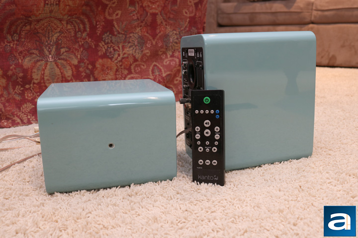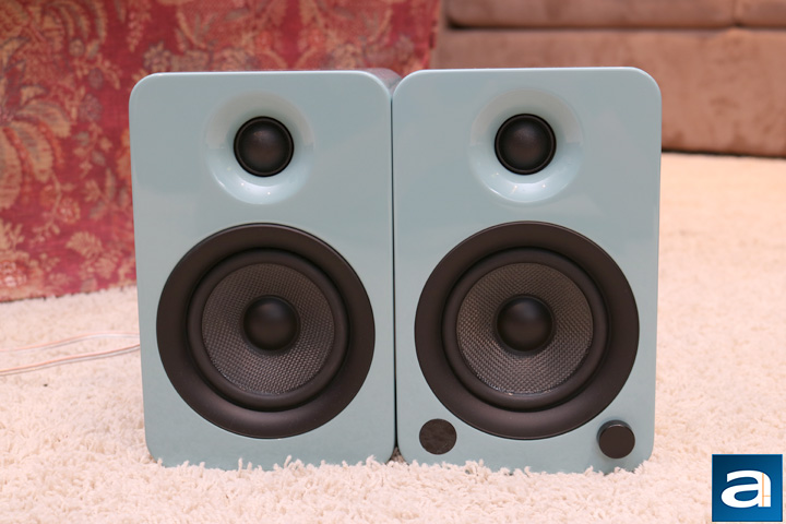 The front of both speakers is identical, except for the little knob and LED light found on the right speaker. Right by the LED light, the infrared receiver for the remote control is also found. Enclosed in the blue cabinets are 4'' Kevlar drivers and 1'' silk dome tweeters. Together, they have a rated frequency response of 60 Hz to 20 kHz. The total harmonic distortion is rated at < 0.25%, while the crossover frequency is rated at 2.0 kHz. The rated impedance comes in at 4 ohm. The Kanto YU4 speakers are powered speakers, meaning they have an internal amplifier. The YU4 in particular has a Class D amplifier. We will see how all of these technical specifications come together for a real world test on the next page.