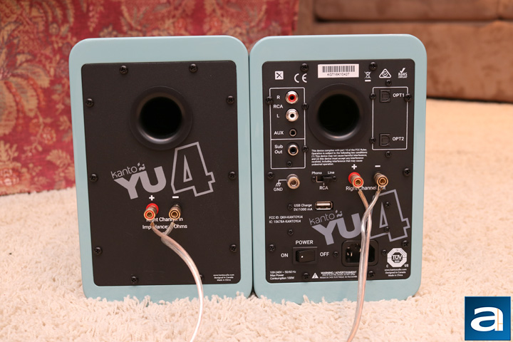 The Kanto YU4 speakers are a bit more business in the back, party in the front type of deal instead of the usual saying, haha. This is common over all speakers though. The Kanto YU4 has a lot of different connections in the back to make them easy to use and compatible across a wide range. The right speaker in the above picture is where all the fun occurs, while the left speaker only has the connections it needs to connect the two speakers. Starting at the top left is the RCA/LA connection; it is especially easy to connect a turntable with an integrated phono preamp. There is also a switch to change between phono and line input. Below this input is the common AUX connection, which is a typical 3.5 mm jack. On the right side, there are two optical cable inputs. You can also connect wirelessly via Bluetooth powered by Qualcomm aptX. As for outputs, there is a subwoofer and 5V USB charger connection. At the bottom is the connection for the integrated power supply, with a rocker style switch to easily turn the speakers on or off.