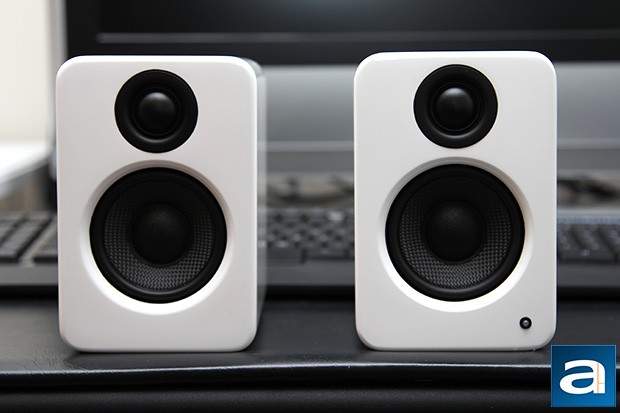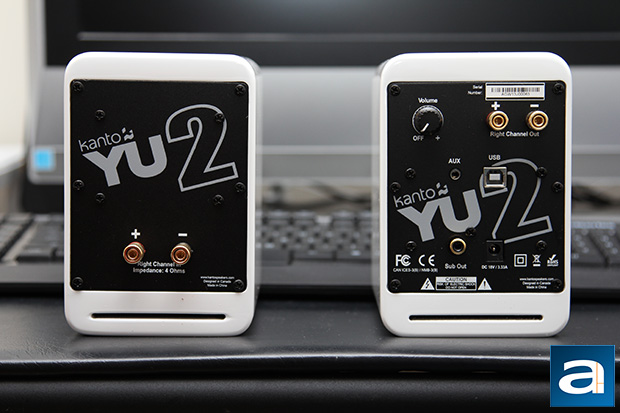 From the front, both the left and right speakers look almost identical -- save for the fact the left speaker has a blue LED at the bottom right corner to indicate its power status. If you are paying attention, yes, the left and right speaker is swapped in my photo above. At the bottom is a 3" Kevlar woven composite woofer with rubber surrounds, and at the top is a 0.75” silk dome tweeter set at 2.5kHz crossover. Together, their frequency response is rated at 80Hz-10kHz ±6.0dB, but despite its studio monitor looks, do not expect flat response all the way down to 80Hz. We will talk about that in our evaluation on the next page. The use of high end materials for construction allows reduced distortion at high volumes, and it is tough enough to alleviate the need to speaker grilles. That said, it will still be wise to keep your three year old kid away from your $150 speakers in my opinion, haha. Sensitivity is specified at 84dB and THD+N at 0.1%. One major complaint I have is Kanto did not include any front audio controls for the YU2, just like the Audioengine A2+. The volume control knob is at the back, which is quite unintuitive. I agree it makes the speakers compact, good looking, and symmetrical, but you will have to sacrifice some functionality for that.