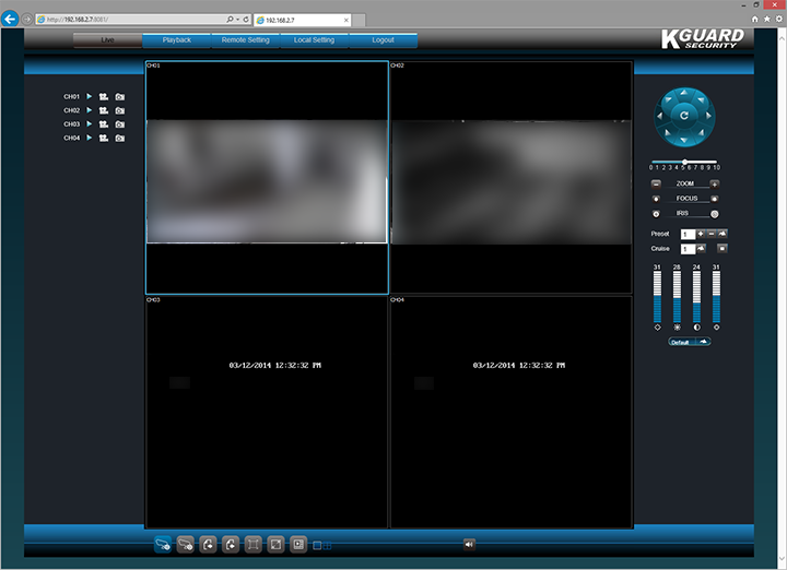 Once logged on, you will be greeted by a live view of all four camera channels, as shown in our screenshot above. Each channel tile is labeled CH01 through CH04, and the video stream is overlaid with the date and time. You can also configure a custom label, for example, "Kitchen" or "Stairs", just for convenience's sake -- more on this in just a moment. If you would like to view one camera only, simple double click on the channel you want, and the corresponding view will be maximized. To exit single camera view, simply double click the channel again.