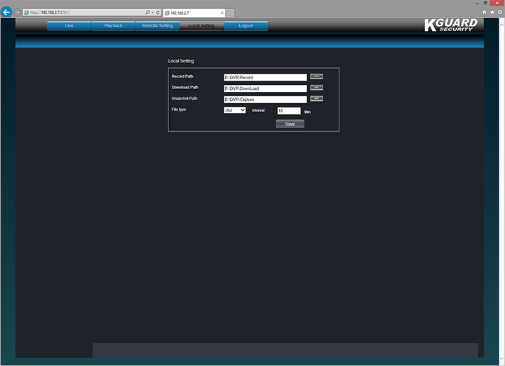 Record controls are located on three sides of the preview window in the middle. On the left, hit the "Play" button to open and close individual channels. The camera button allows you to record video to your local drive, while the camera button allows you to take a screenshot to your local drive. The location on the client PC can be configured by hitting the "Local Setting" tab at the top, which, once again, we will take a look at shortly.