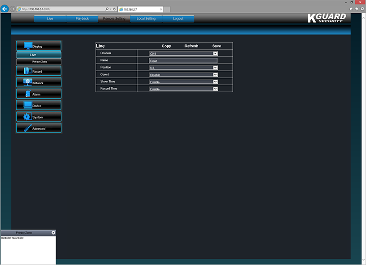 Next up is the Remote Setting tab. Here, you can configure all settings related to the KGUARD Easy Link EL421-4HW212B system. Everything you can configure directly on the DVR can be set here as well, which is very convenient. A navigation menu is located on the left. In our screenshot above, it shows the Display screen. The Live section allows you to set individual channel overlays such as name, show time, record time, and the overlay position. Privacy Zone allows you to black out up to four areas on the camera, and prevent the highlighted section from being viewed or recorded.