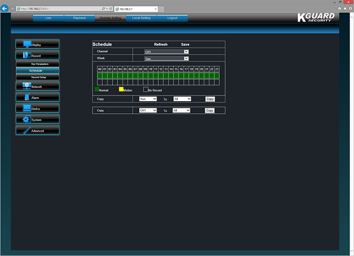 Under the Record header are three subsections. This includes Rec Parameters, Schedule, and Record Setup. Rec Parameters allow you to enable or disable recording for individual channels, set pack duration from 15 minutes to 60 minutes in 15 minute intervals, and enable or disable pre-recording. The Schedule tab, as shown in our image above, provides a relatively graphical interface to set what day of the week to record each channel, and what time intervals you would like to record. While the day of the week is to be selected by a drop down menu, the hours of the day highlighted by dragging your mouse along the boxes in the middle. You can also set it to trigger recording on motion only, but personally, I prefer to have it recording at all times. If you would like to propagate the settings on one channel to all the other channels, simply play around with the Copy buttons at the bottom.