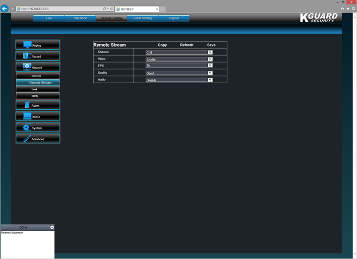 As far as the Network tab is concerned, everything is quite straightforward. In fact, it is almost self explanatory. The Network subsection under the Network tab has options for configuring whether you would like DHCP, PPPoE, or Static IP; as such, options corresponding to it like client port, HTTP port, IP address, gateway, and the like can be set. The KGUARD Easy Link EL421-4HW212B supports UPnP as well, but it is disabled by default. Personally, I prefer to configure my router port forwarding rules manually, but I understand this is not for everyone. For my screenshot above, decided to show the second subsection, which is "Remote Stream". Here, you can enable or disable video, set streaming FPS, configure quality, and toggle audio on and off -- if supported -- for individual channels. The next two subsections are Email and DDNS, where you can specify a remote SMTP server and DDNS provider, respectively. If you have set up any network appliance before, it is exactly what you would expect; absolutely no surprises here.