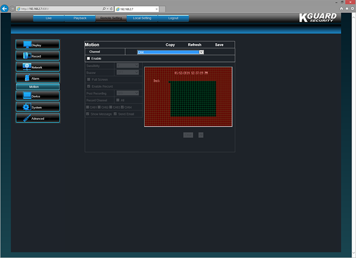 The Alarm section only has one option, and that is Motion. It provides a preview of the corresponding active channel, and overlays the image with a grid. When enabled, you can highlight areas of your image for motion detection; this can go as small as one box to as large as the entire screen. Its sensitivity can be selected -- too sensitive, and you will get tons of false alarms from things like dust; too insensitive, and you will miss out important details -- to your likings. You can also set it to do specific tasks in event of motion detection, such as activate recording and send email to a pre-configured address. The email will come with a photo of when it was activated. This is a pretty useful feature, but it will require some time to tune its sensitivity to work properly.