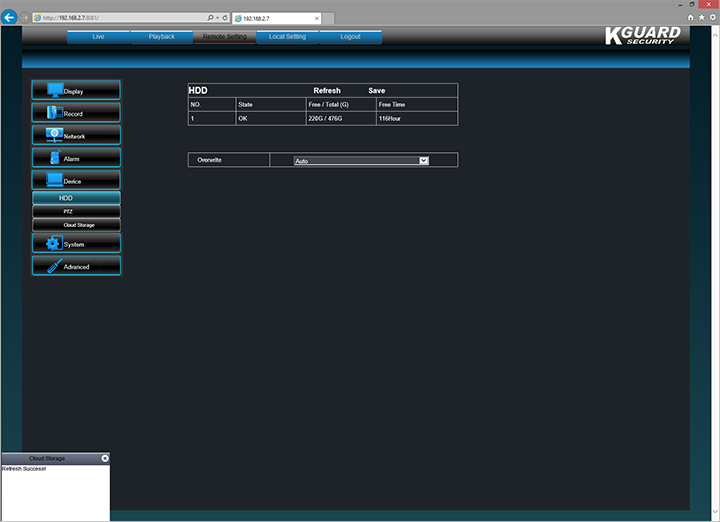 Options configurable under Devices is probably not too interesting for the purpose of this review, so I will quickly cover it, and not waste too much of your time in this area. The HDD screen shows all the connected hard drives, operational status, total capacity, available space, and free time. When the disk is full, you can configure your KGUARD Easy Link EL421-4HW212B to make a decision on what to do with the old data -- preserve certain video for a minimum amount of time before overwriting, or automatically overwrite when disk is full. Automatic overwriting is probably the best option, which is the option selected by default.