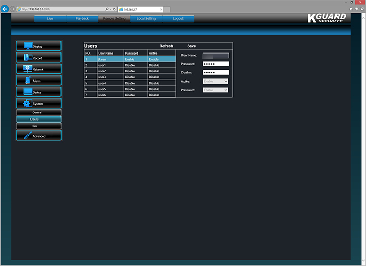 Moving on, we have the System section. The General screen allows you to configure the usual items like system time, date format, time format, language, video format, menu time out, and select DST or NTP. Actually, I just listed all of them, haha. Our screenshot above is the Users tab, where you can enable up to eight users to access your KGUARD Easy Link EL421-4HW212B DVR. The username is limited to eight characters only, while the password is limited to six. If you have special characters in your password, it will not work with the iPhone application, which I will talk about in just a moment. Lastly, the Info screen shows your DVR hardware and software information.