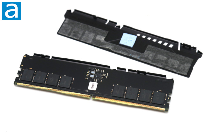 Looking at the black PCB itself, you can see the primary difference of DDR5 memory is the inclusion of a power management integrated circuit, or PMIC, in the middle of the module. DDR4 RAM power management is handled by the motherboard, however DDR5 has the PMIC directly on each stick of RAM. Kingston has placed a large blue thermal pad on top to ensure this area makes contact with the aluminum piece.