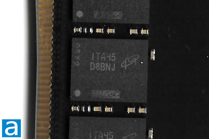 Taking a closer look at the memory chips on the Kingston FURY Beast DDR5-5200 2x16GB dual channel memory kit shows the eight Micron branded chips. Each are marked with the short code "D8BNJ", which is short for the full part number "MT60B2G8HB-48B:A". Each chip is 2GB in capacity and located on one side to make for a total of 16GB on each DIMM. As mentioned previously, this RAM kit runs at a frequency of DDR5-5200 with 40-40-40-80 latencies. These latencies are notably higher than that of DDR4 memory, but this is expected for DDR5. This module operates at a stock voltage of 1.25V, which is under the maximum safe limit of 1.35V set by Intel and AMD. Here are the listed features for the ICs, as obtained from Micron: