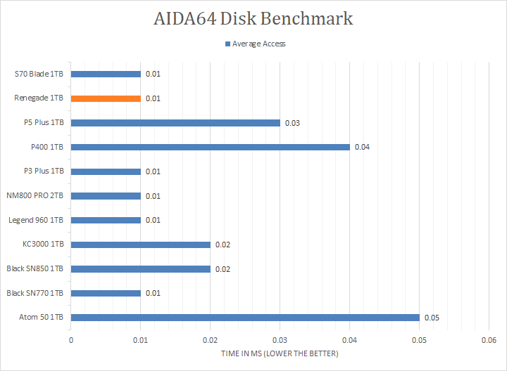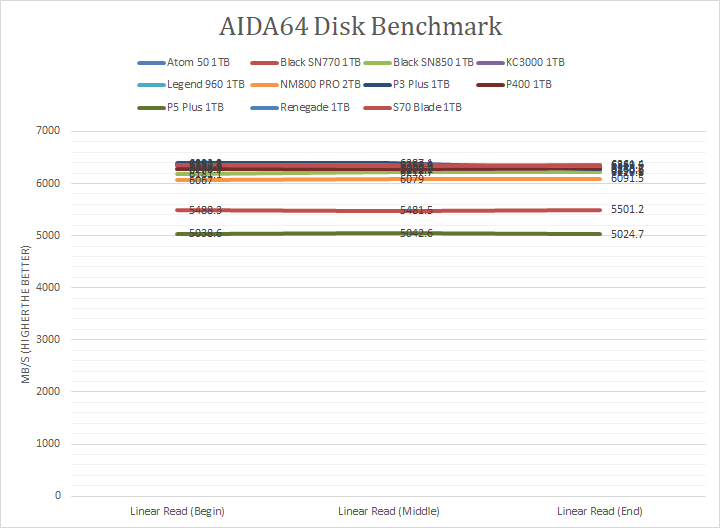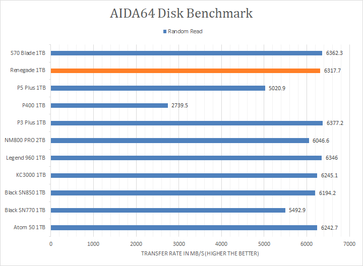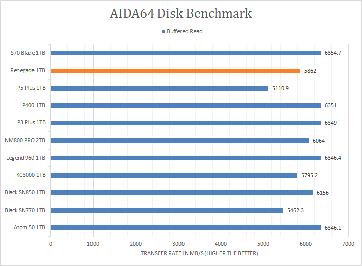Since our SSD review benchmark results are presented in alphabetical order, first up on the list are results from one of our favorite benchmarking programs, AIDA64 Engineer. Version 6.85.6300, the latest release at press time, can be downloaded from our Downloads page. Just to note, AIDA64 Engineer is a full synthetic benchmark. Unlike full synthetic motor oil, this usually does not always carry a good connotation. While it is not a representation of real-life performance -- such as how fast Photoshop opens -- it does provide valuable insight into performance between different drives and different controllers. As you can see in our graphs above, the Kingston FURY Renegade 1TB placed in or near the upper segment in the linear read, random read, and buffered read tests. The FURY Renegade scored consistently around the 6355MB/s mark in the linear read segment, and the tested latency was very low with an average of 0.01ms. The FURY Renegade was marginally faster -- about 1.2% on average -- than the KC3000 1TB. The comparison results against all the other drives can be seen in our graphs above.