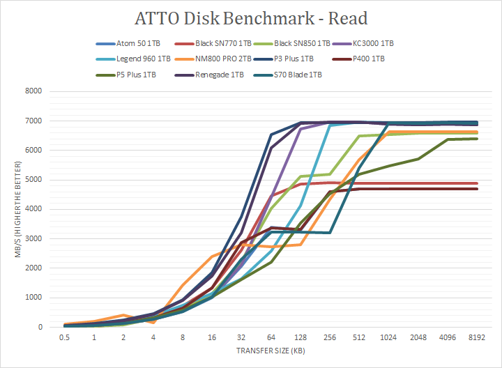 Following up next are our usual ATTO read and write tests. ATTO is an often-quoted benchmark because it is easy to use and accurate. For the most part, it is a favorite among reviewers, and I have grown to embrace it as much as the next for the last little while. ATTO uses easily compressible data, so compression-heavy controllers will perform very well here. As far as the Phison PS5018-E18 controller on the FURY Renegade is concerned, well, here are our results. The Kingston FURY Renegade 1TB peaked at 6970MB/s read and 5690MB/s write. Under the read curve, it delivered solid speeds with a decent margin ahead of the ADATA Legend 960 1TB until 512K. The much cheaper Crucial P3 Plus 1TB was the fastest up to 512K, and even then, the FURY Renegade 1TB was mostly tied with it. Under the write curve, the Kingston FURY Renegade 1TB continued to deliver near chart-topping performance across the range, but it was still no match for the newer ADATA Legend 960 1TB and bigger capacity Lexar Professional NM800 PRO 2TB. Overall, the Kingston FURY Renegade 1TB's performance is still excellent, thanks to the fast PCIe 4.0 interface, powerful controller, and improved firmware compared to the KC3000.