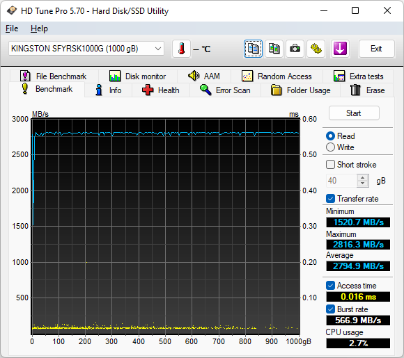 Unfortunately, HD Tune does not generate any fancy independent graph outputs in particular, so I just took a screenshot of the program. The Kingston FURY Renegade 1TB's throughput remained very flat on average. While HD Tune is more of a drag race than a clear indication of real-life performance, it is an excellent storage performance reference among SSDs with the same controller. The results were good across the range and the recorded access time was low, as we would expect from a solid state drive.